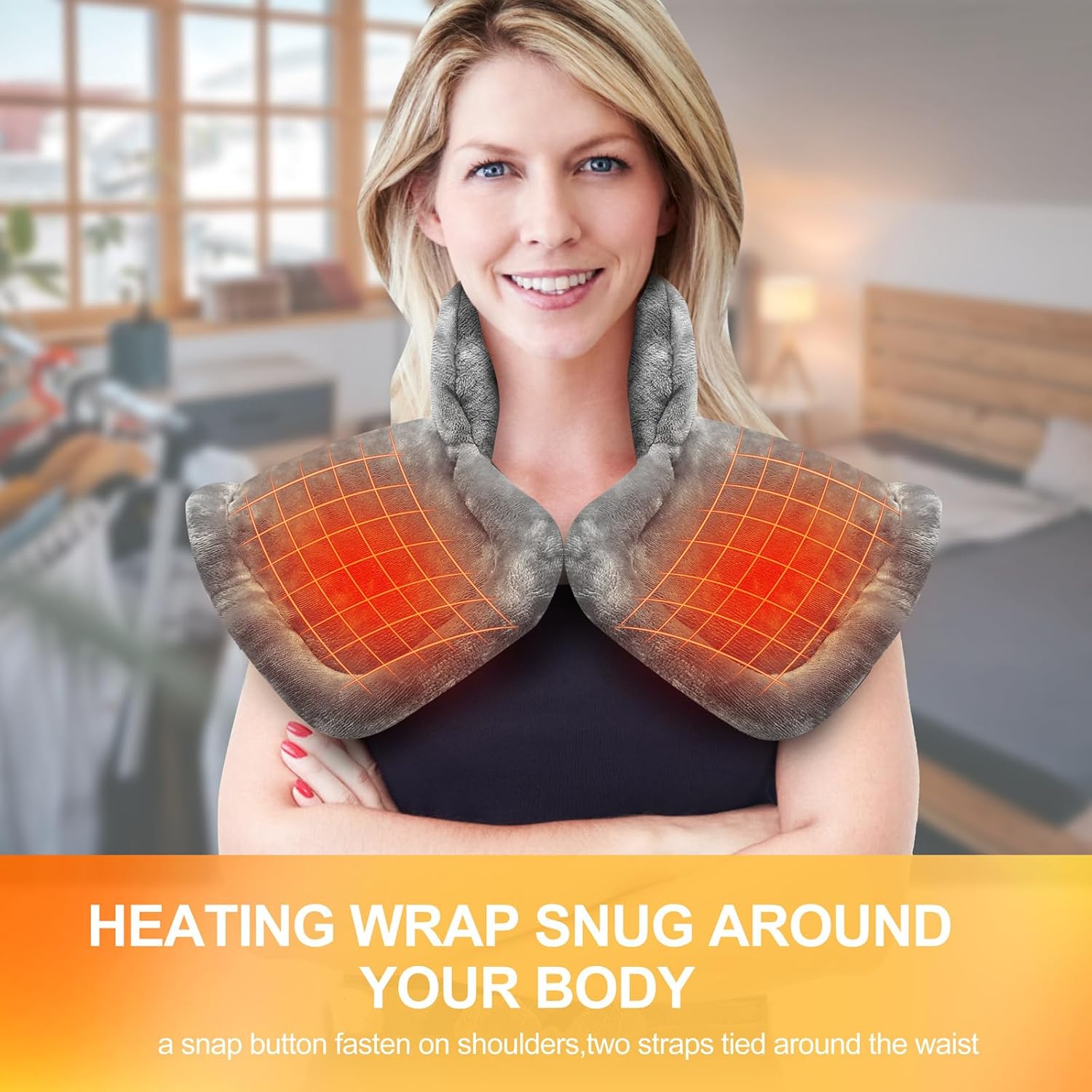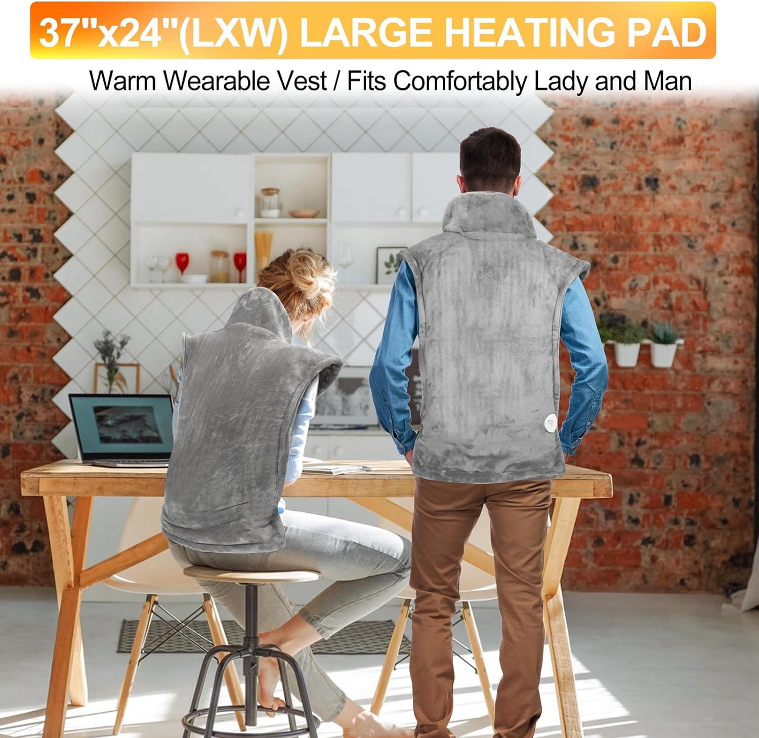 Large Wearable Heating Pad (37''x24''): This electric pad fits over your back and neck like a vest, with weighted shoulders, a front snap, and waist straps for a snug fit.Keep your entire back very warm in winter to avoid the physical discomfort caused by changing seasons.